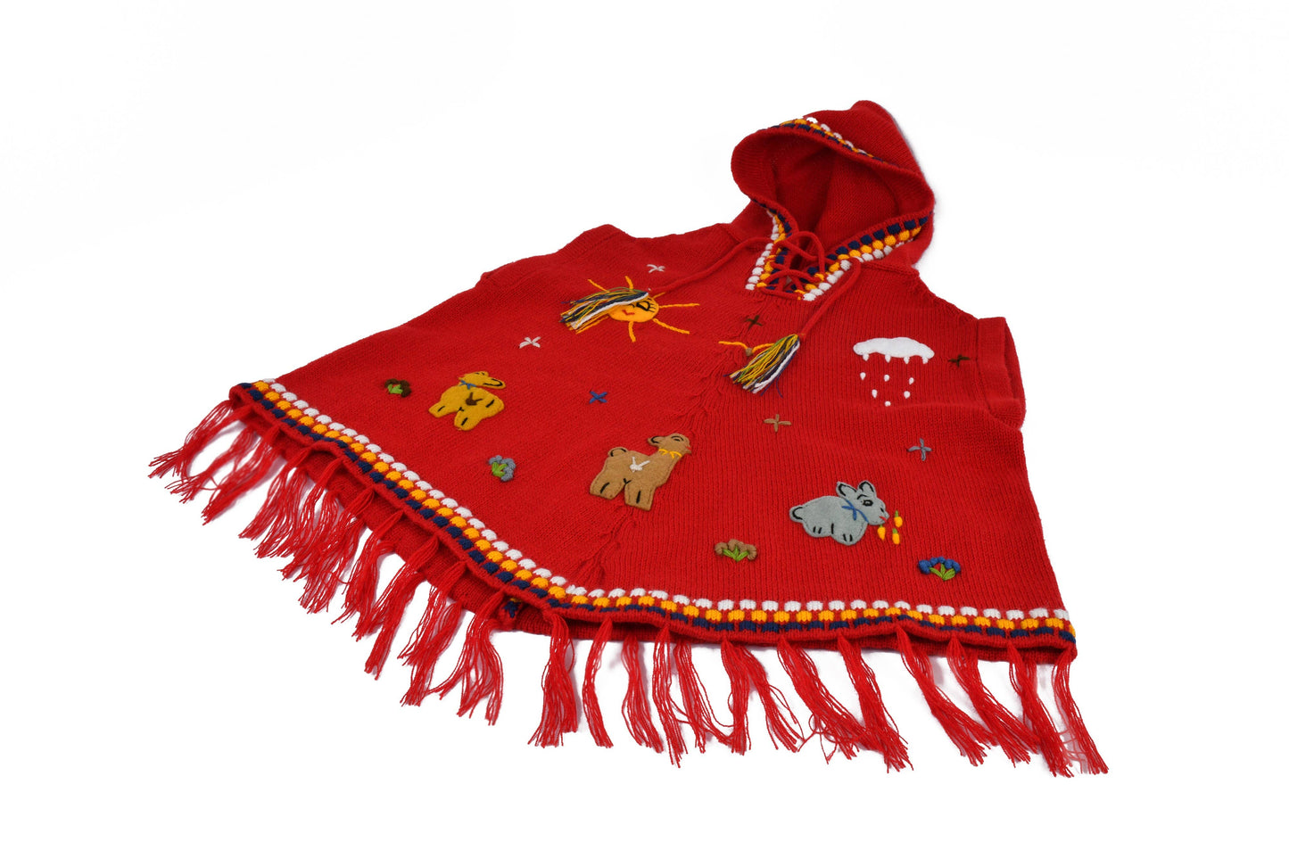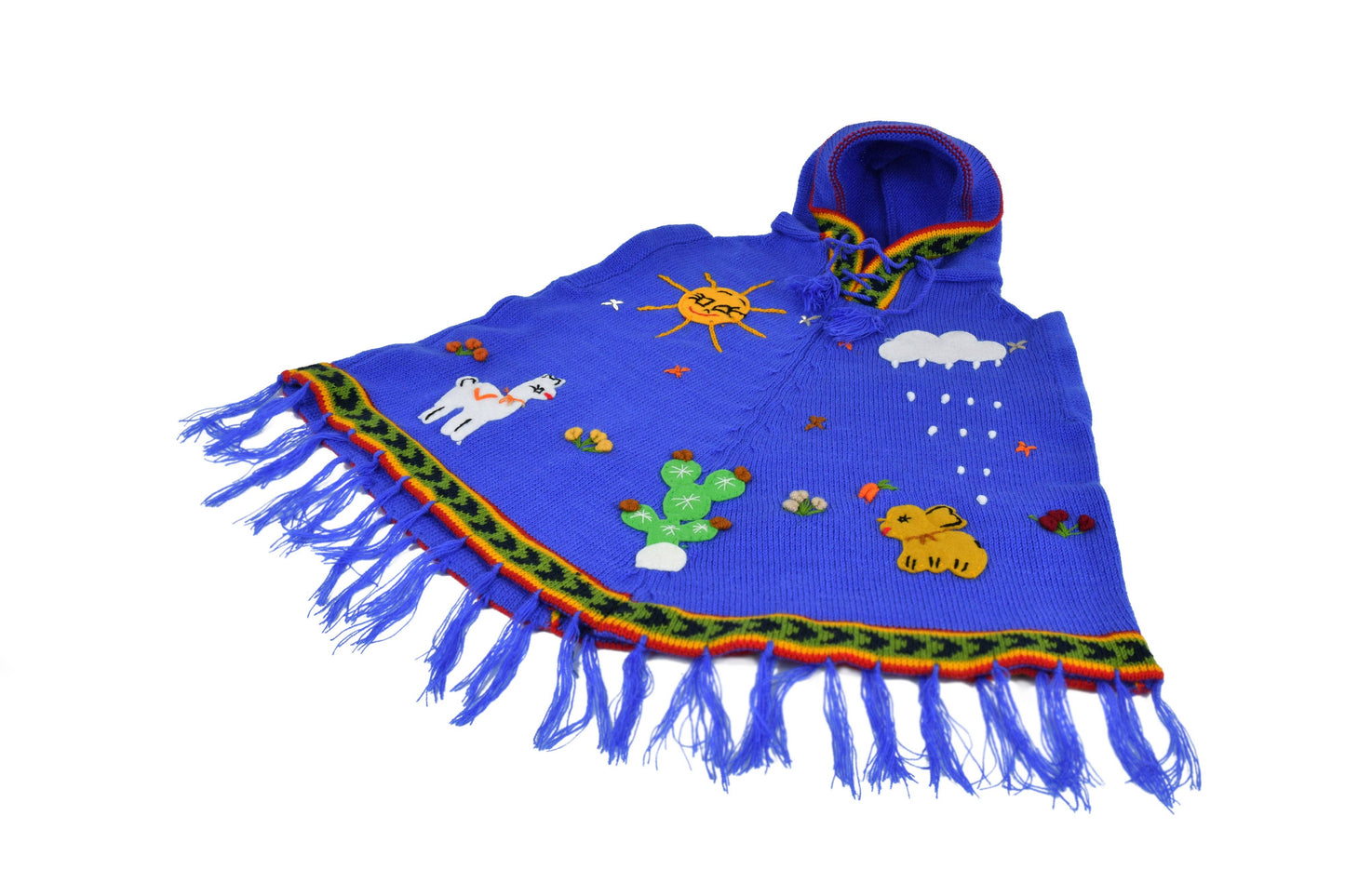 Child Poncho Applique with Hood Cotton Knit Sleeve Opening Multicolored. One of our hottest items, these child-zippered hooded ponchos are decorated with playful figures using a style of applique called arpillera. As adorable as it gets. Many colors available. Specifics: sizes available from 0,2,4,6 100% cotton assorted colors