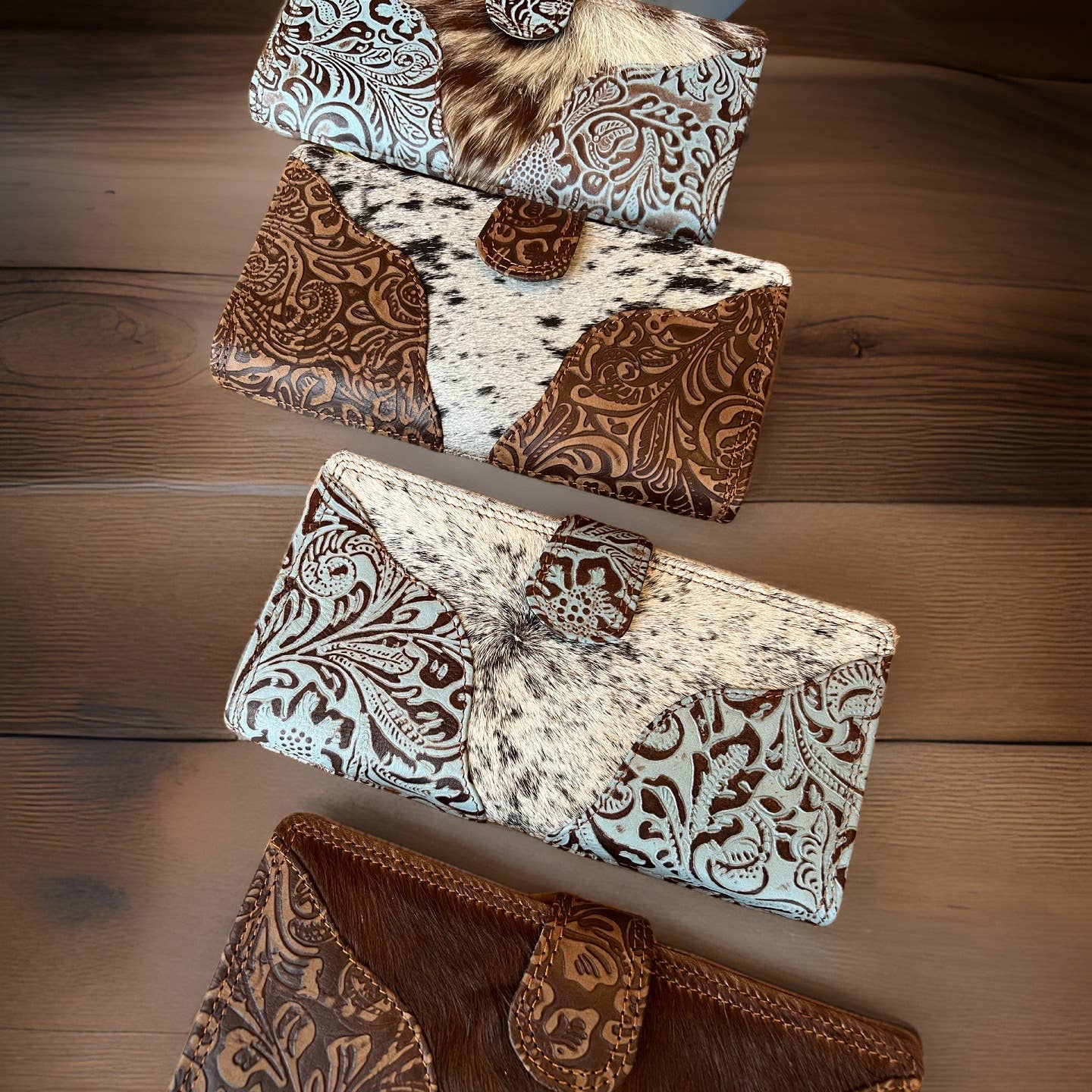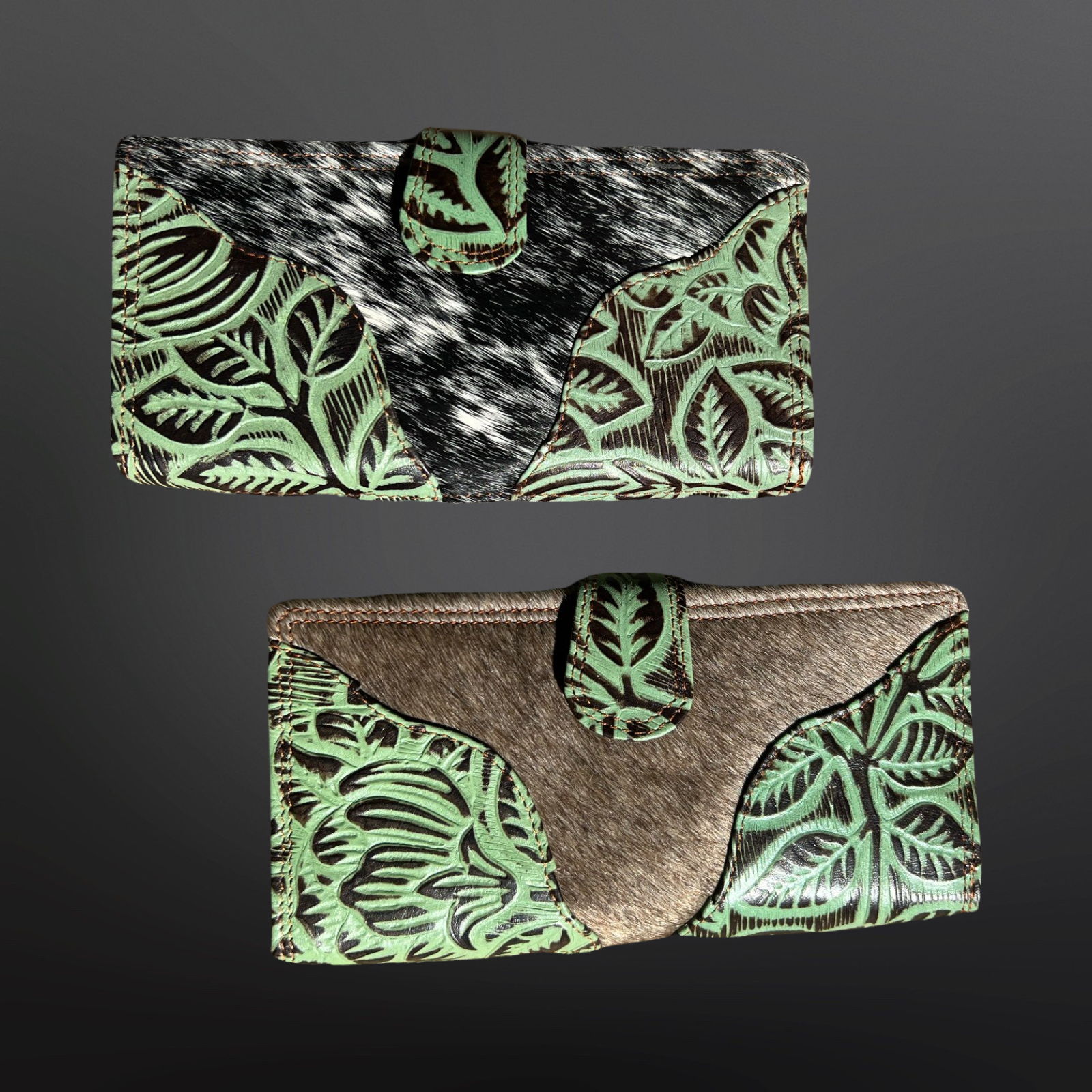 Hand tooled leather and genuine cowhide combined to make the essential wallet. Snap close front, rear zip pocket and lots of room inside for credit cards, money and even a check book. Available in two colors: Brown tooled leather or turquoise tooled leather.