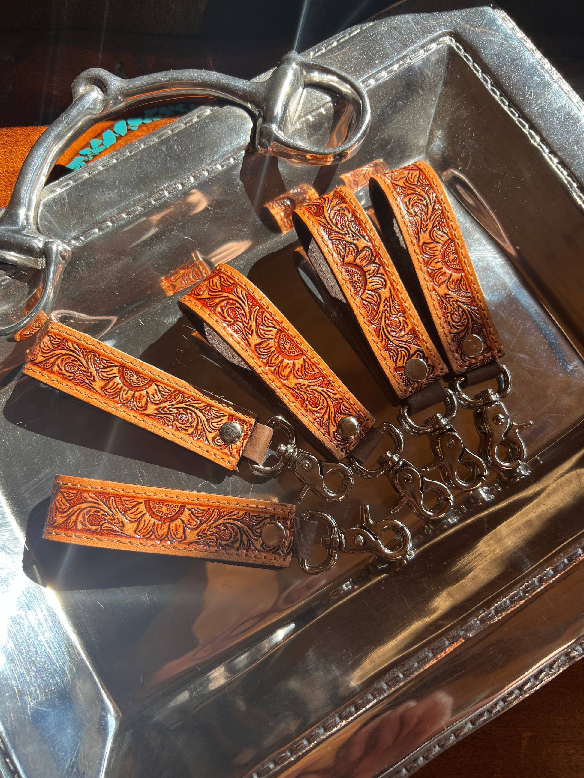 Cute tooled leather keychain with a sunflower design. Stainless steel trigger snap closure. This can be used to add a handle to your favorite little crossbody bag.